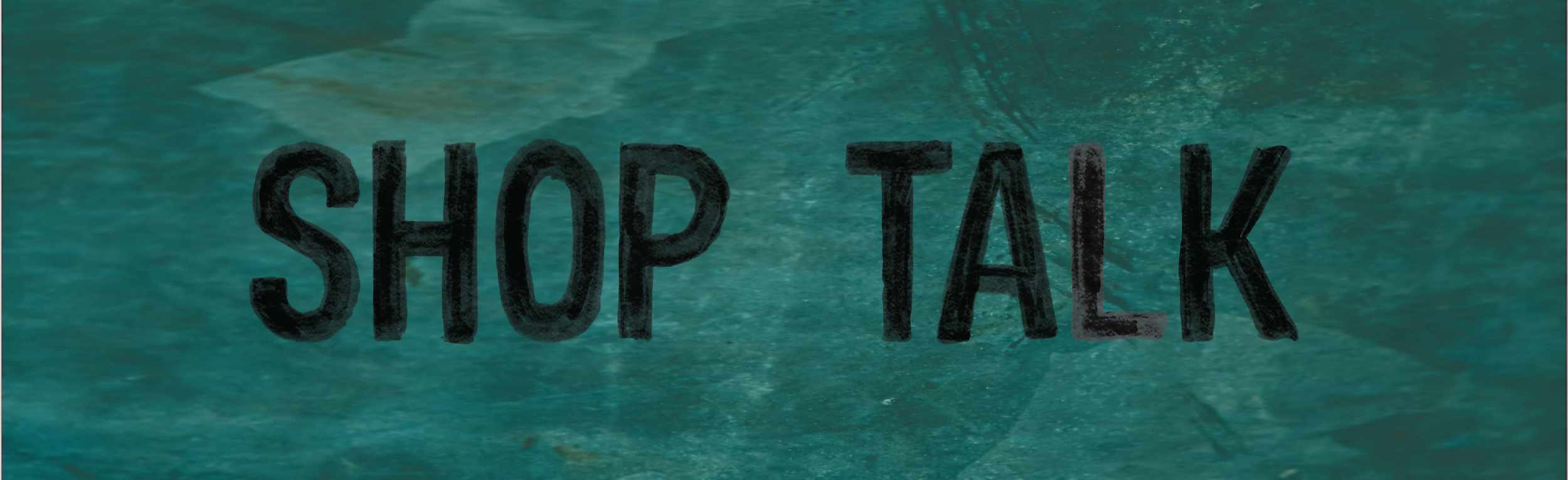 Text reading 'SHOP TALK' written in black over a textured teal background.